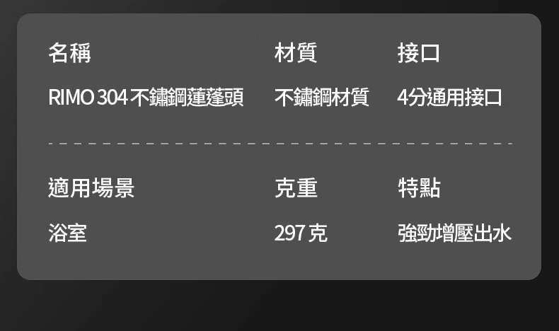 半小時前RIMO 304不鏽鋼增壓蓮蓬頭 - RIMO 304不鏽鋼增壓蓮蓬頭(獨享一入組)NT$899