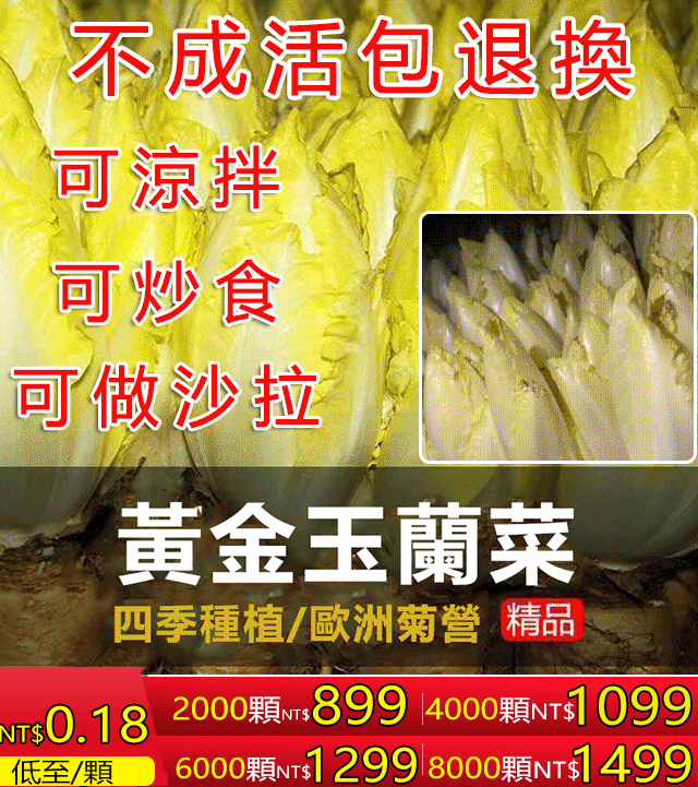 7分鐘前清脆可口的【黃金玉蘭菜】居然這麼簡單就可以種出來!生吃脆香甜,炒肉比肉鮮,輕輕鬆鬆幾個月就可以收穫,關鍵是年年可以割,年年可以長,年年有的吃 - 僅此一天!比利時「金玉蘭種子」8000顆(送狀根肥料)100%用戶的選擇!NT$1499